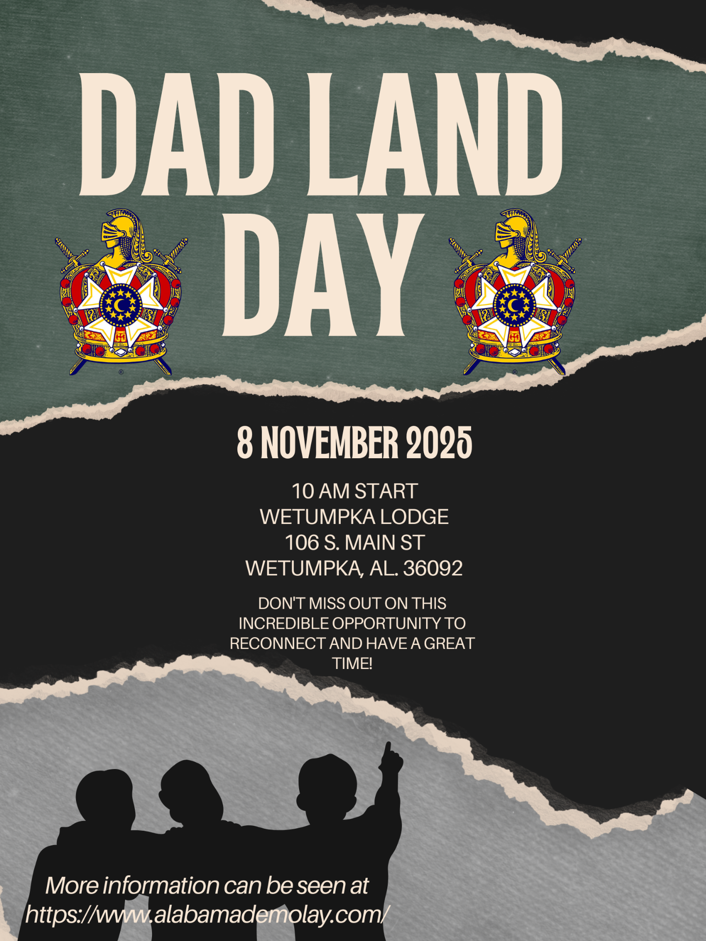Join us for "Dad Land Day"! This event is open to active DeMolays, senior DeMolays, their parents/guardians and Master Masons. This event will start at 10 AM with degrees and will move to a nearby park at 12 noon for some food and fun!