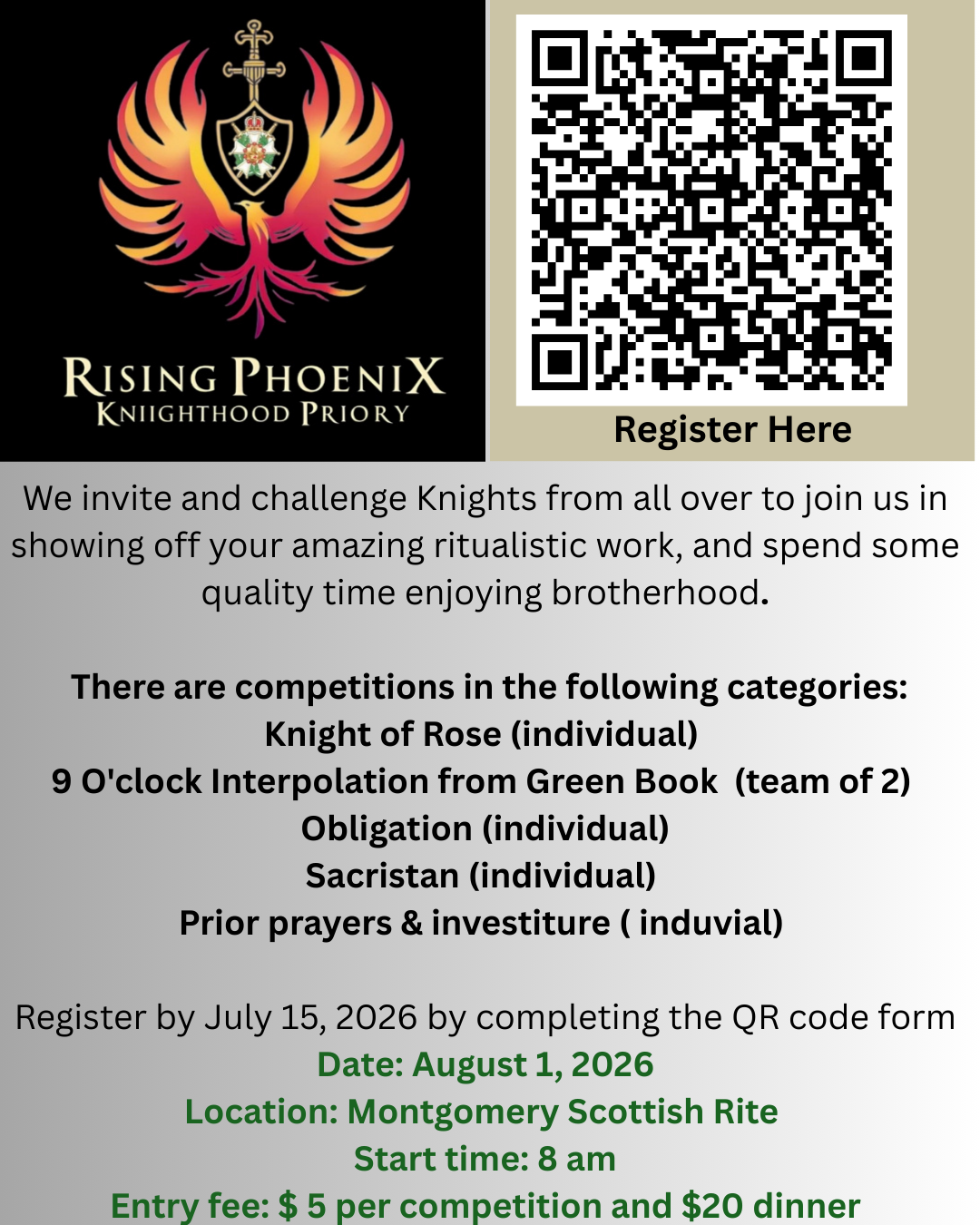 This event will be held at the Montgomery Scottish Rite building and is open to ALL Knights. Knights from ANY Priory and welcome and challenged to compete in ritual competition.