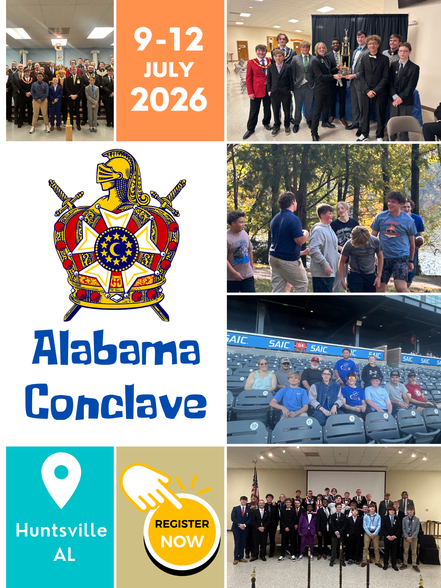 We would love for you to be able to attend Alabama Conclave! It is a time for fun and to show off what our young men have worked so hard on throughout the year. 2026 Conclave will be July 9-12 in Huntsville, AL Cahaba Shrine.